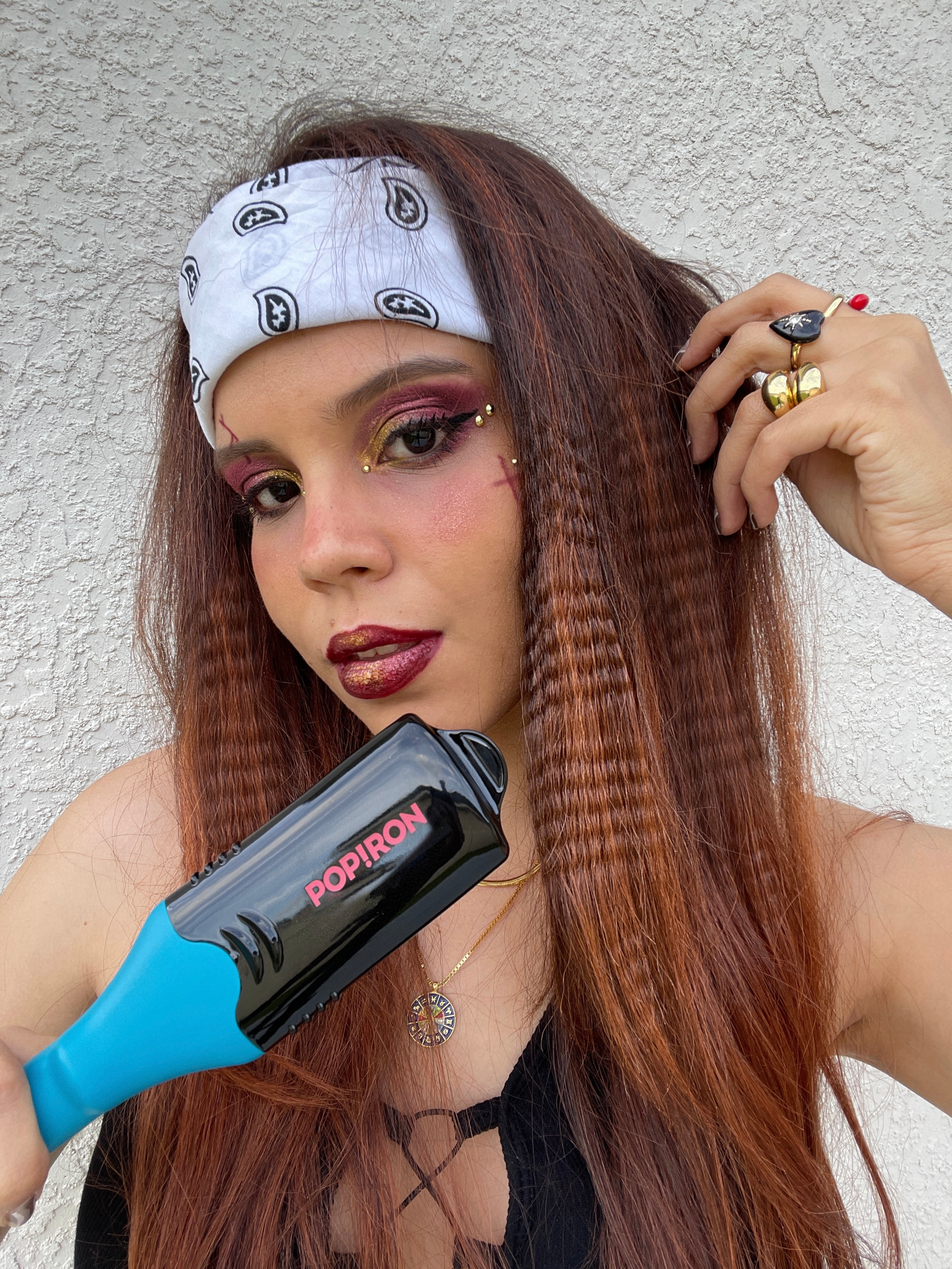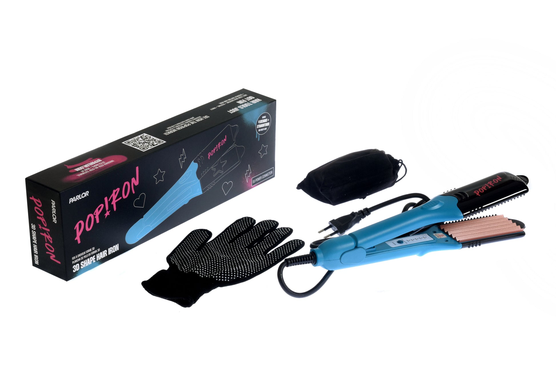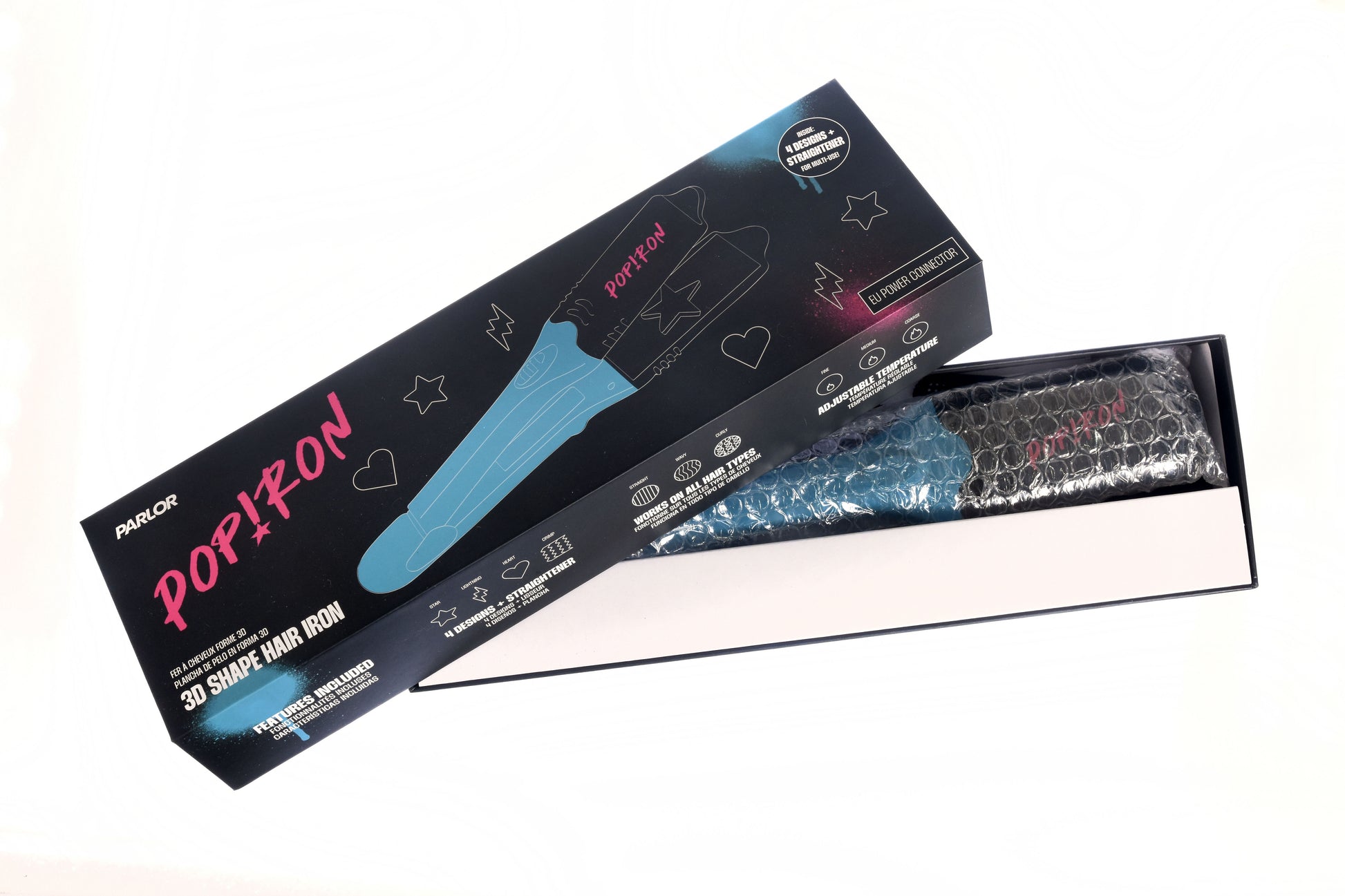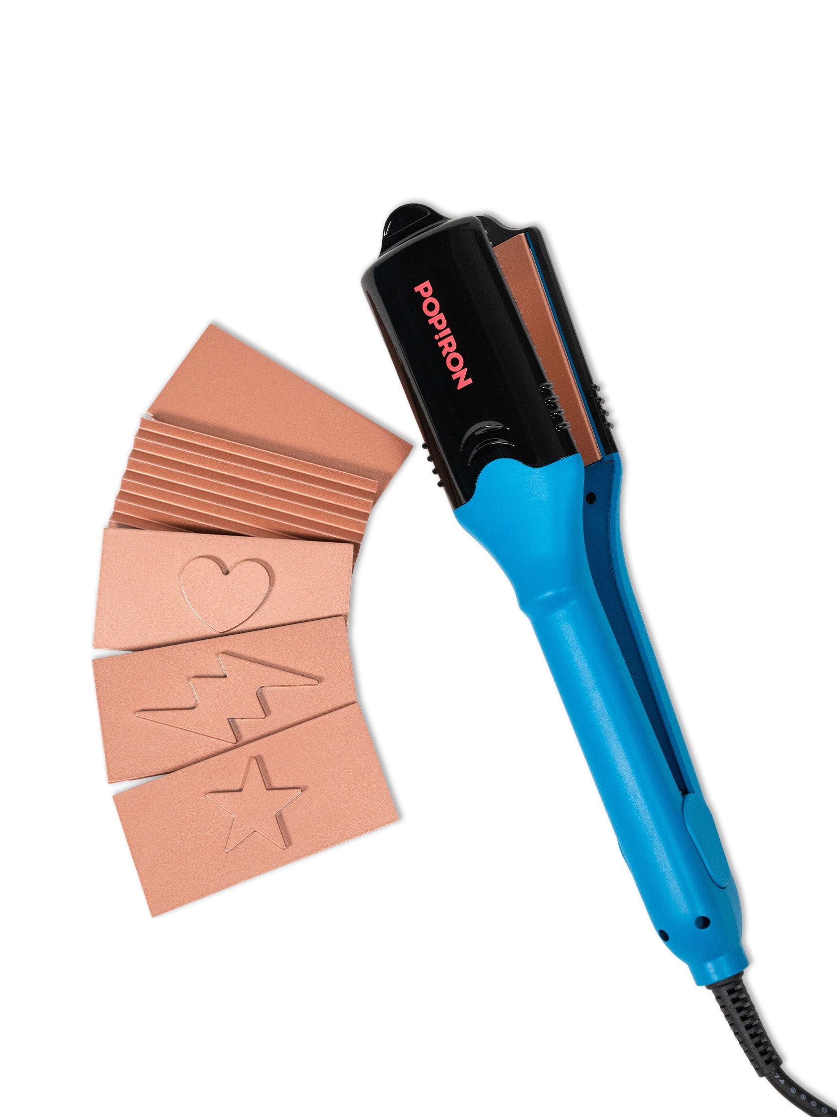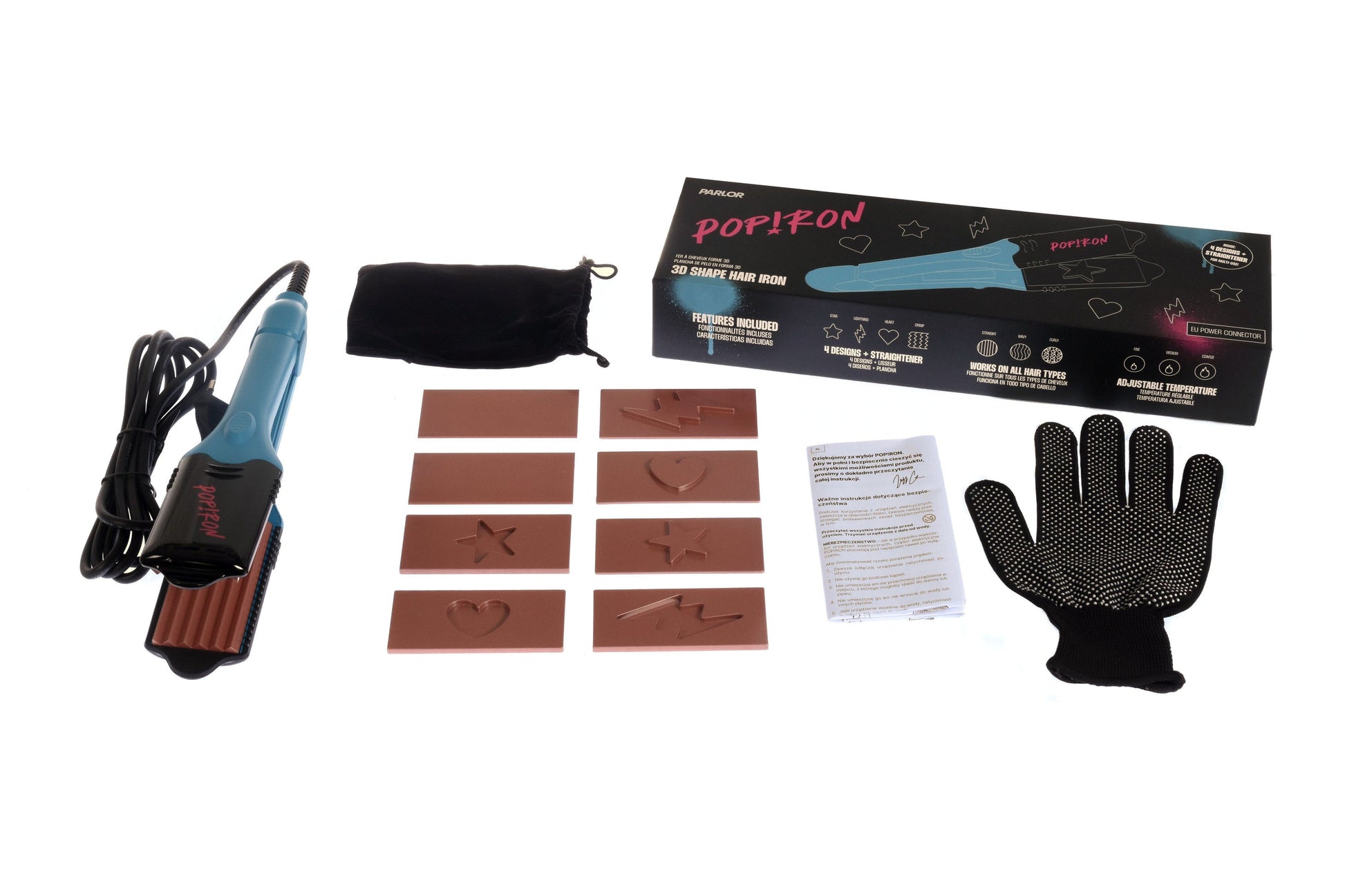 Dzięki unikalnemu designowi 5-w-1, zawierającemu trzy płytki kształtujące (gwiazda, błyskawica, serce) karbownicę oraz klasyczną gładką płytkę, Pop!ron pozwala przemienić twoje włosy z gładkich i prostych w fantastycznie funky z trójwymiarowymi odciskami.